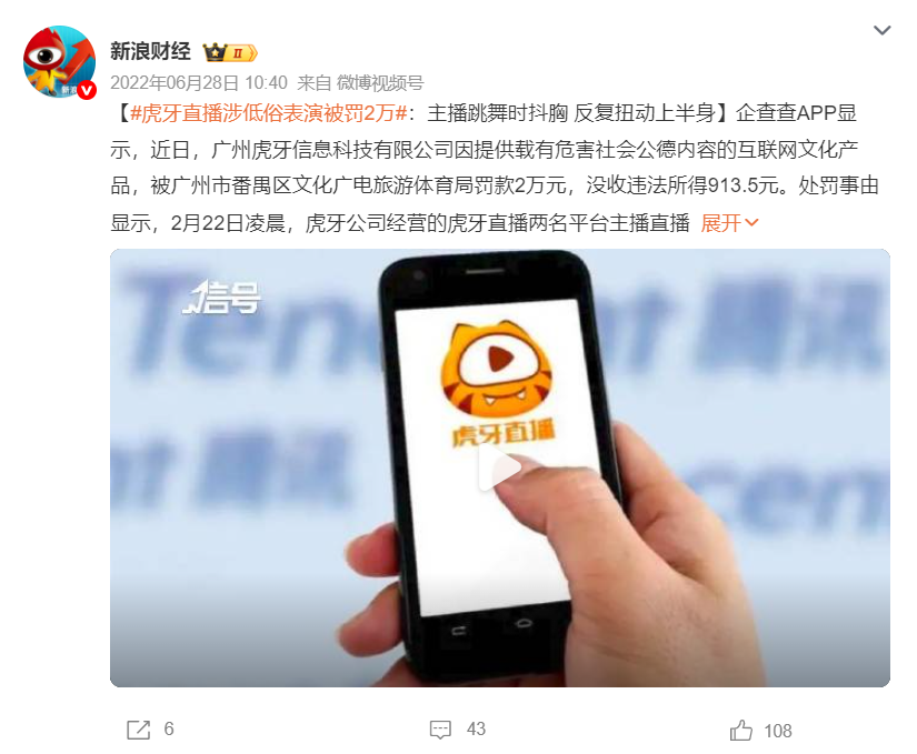 不过,从结果来看,整改效果似乎有限。2022年,虎牙因部分主播直播时出现擦边行为被广州市番禺区文化广电旅游体育局罚款2万元,没收违法所得913.5元。