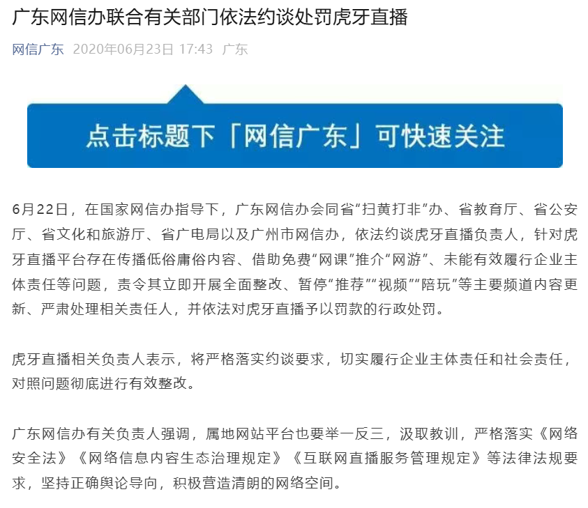 彼时,虎牙直播相关负责人表示,将严格落实约谈要求,切实履行企业主体责任和社会责任,对照问题彻底进行有效整改。