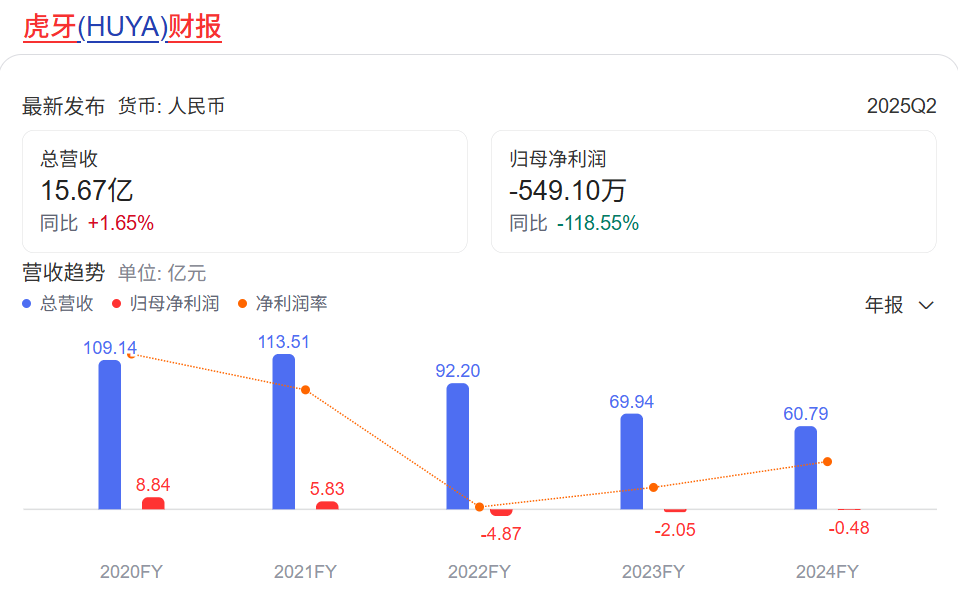 近日,虎牙发布了2025年第二季度财报,公司实现营收15.67亿元,同比增长1.65%;非美国通用会计准则下的净利润从2024年同期的9700万元下滑至4750万元。