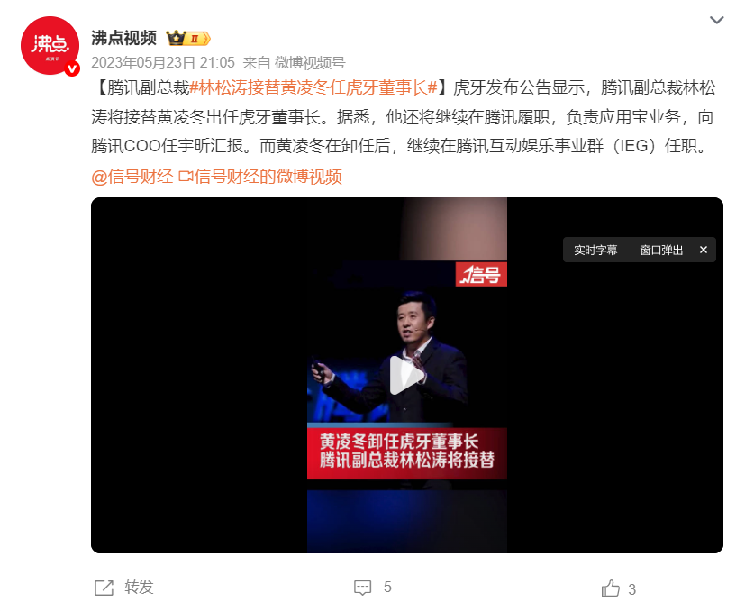 随着腾讯在虎牙拥有绝对的话语权,腾讯系高管逐步接管了虎牙的核心管理岗位。2020年,黄凌冬被任命为董事长,程志、蒲海涛被任命为董事。2023年,虎牙宣布,林松涛接替黄凌冬出任董事长,自2023年5月23日起生效。