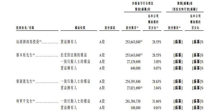 截至9月5日,潮宏基在香港上市前的股东架构中,廖木枝、林军平、廖创宾为一致行动人士,合计持股约31.67%,为单一最大股东集团。