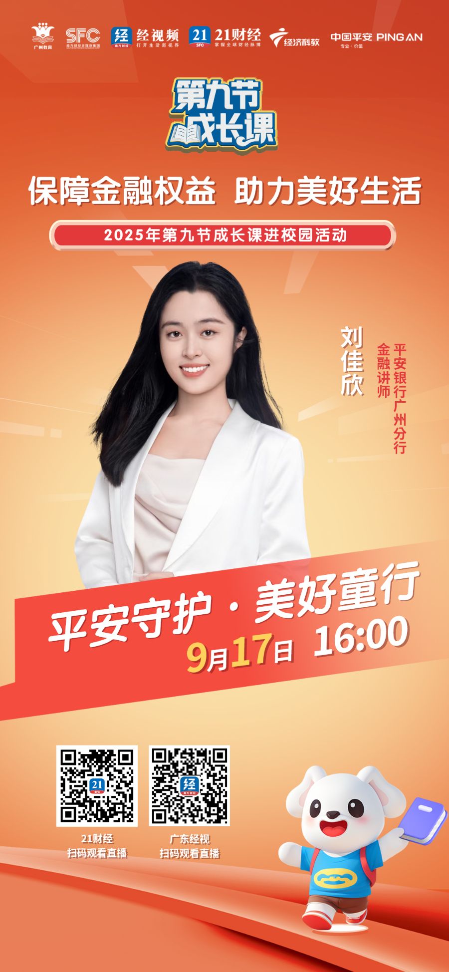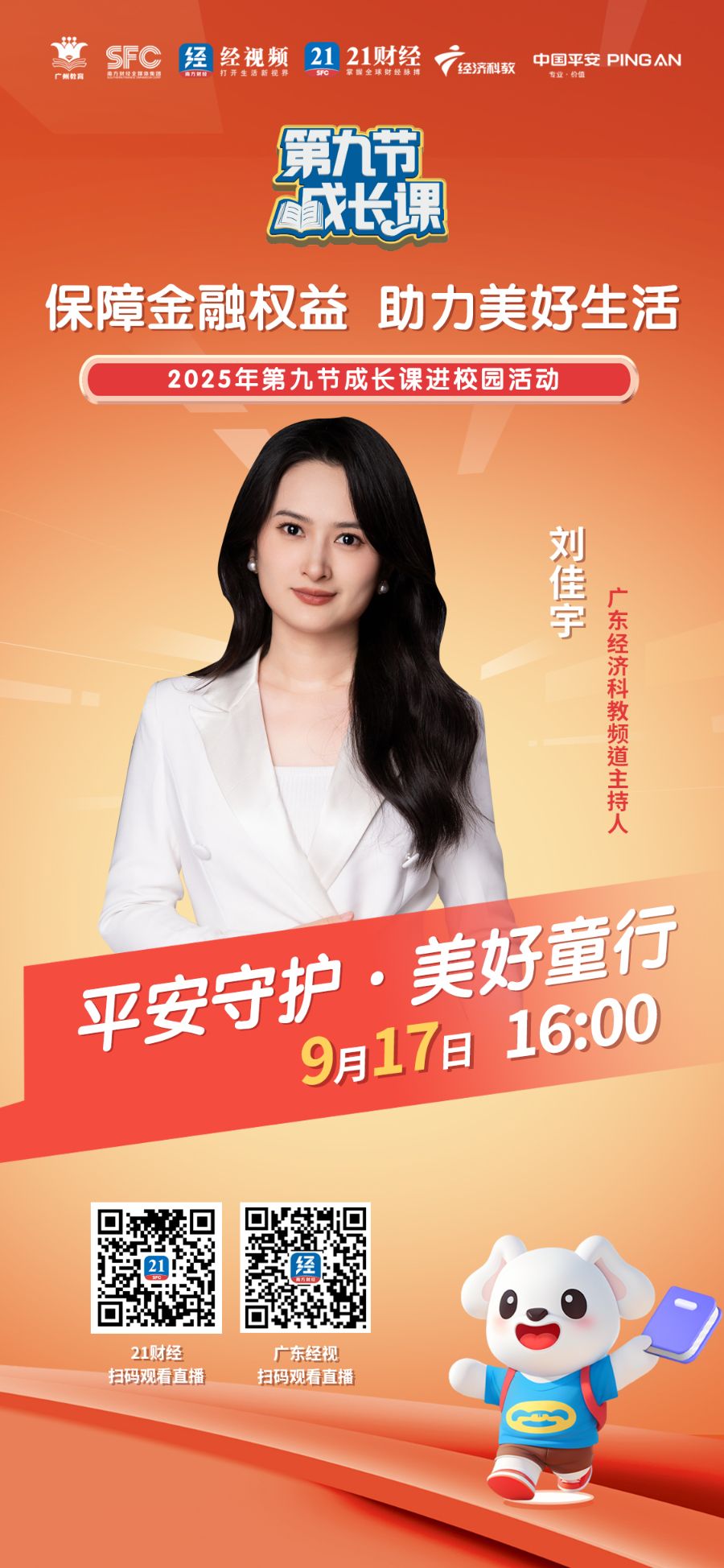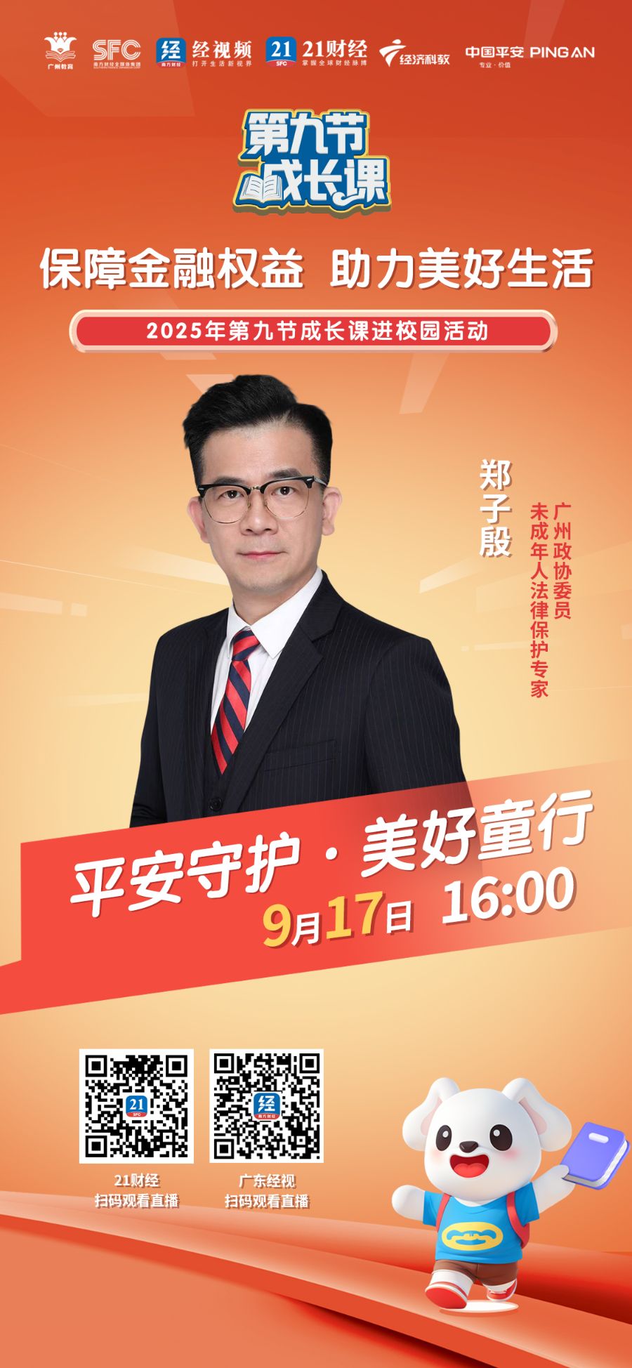 由广东经济科教频道联合广东省教育厅、国家金融监督管理总局广东监管局、广东省司法厅等多家权威单位共同发起的“平安守护 美好童行”2025第九节成长课进校园活动,将于9月17日走进华南理工大学附属实验学校!
