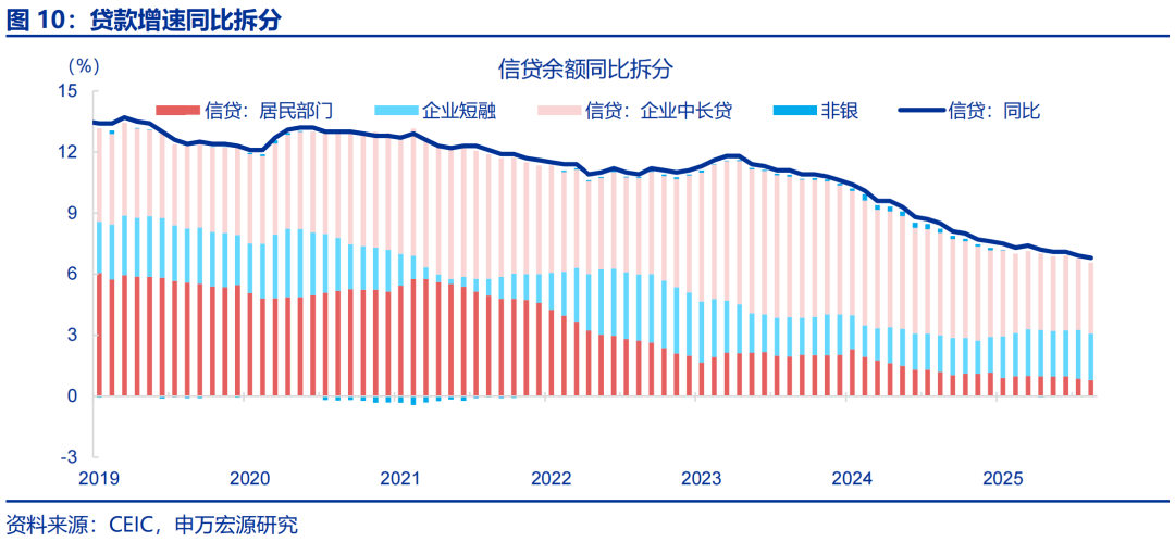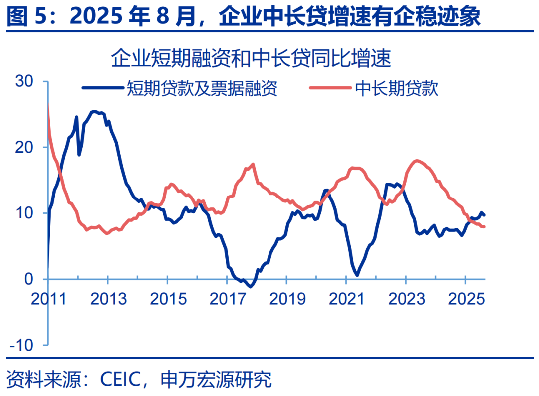 8月企业贷款中,中长贷余额同比增速下滑趋势放缓,企业对投资的态度或从审慎转变为观望。8月企业短贷及票据融资余额同比增速下降0.4个百分点至9.7%,而中长贷余额同比增速基本持平。考虑到8月PPI同比回升至-2.9%、PMI企业生产经营预期指数从52.6回升至53.7,这一贷款结构变化或体现出企业对投资的态度从审慎逐步变为观望。