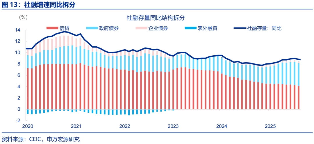 社融存量增速有所回落,源于财政融资“前置”趋于结束。2025年1-7月,社融存量同比增速快速上升,从2024年底的8.0%升至9.0%,主要原因是政府债净融资“前置”,具体来看,累计同比多增4.8万亿。8月政府债券新增13700亿,同比少增2477亿,并未对冲8月人民币贷款少增的幅度,令社融存量同比增速回落0.2个百分点至8.8%。