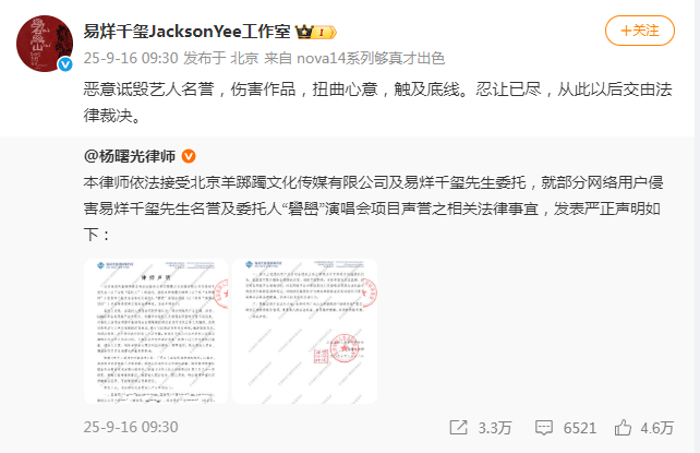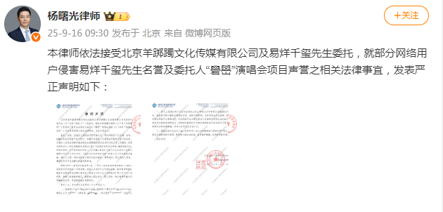 9月16日,易烊千玺方代理律师、北京海润天睿律师事务所高级合伙人杨曙光在微博发布声明:本律师依法接受北京羊踯躅文化传媒有限公司及易烊千玺先生委托,就部分网络用户侵害易烊千玺先生名誉及委托人“礐嶨”(què xué)演唱会项目声誉之相关法律事宜,发表严正声明。