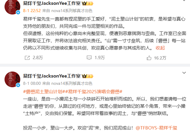 据极目新闻报道,恶意解读源自易烊千玺“礐嶨”演唱会“泥土塑山计划”。