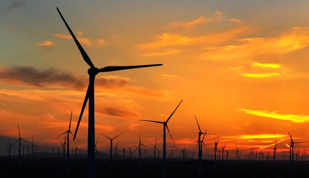 夕阳映照下的新疆哈密市三塘湖风电场一角(2024年9月10日摄,无人机照片)。新华社记者 胡虎虎 摄