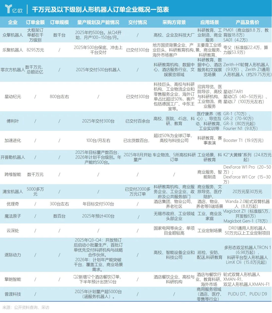 中小规模订单在不同企业间呈现出明显的分层特征。众擎机器人处于该梯队的领先位置,联合创始人姚淇元透露,其大的框架订单多为千万级别,2025年预计交付约500台,月产能在今年四季度已爬升至100~150台。