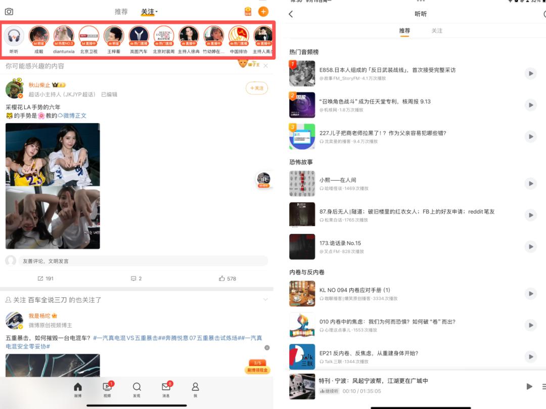 微博选择了两条腿走路,同时发力视频播客和音频播客,并且巧妙地把播客“嵌”进了原有的内容生态里。
