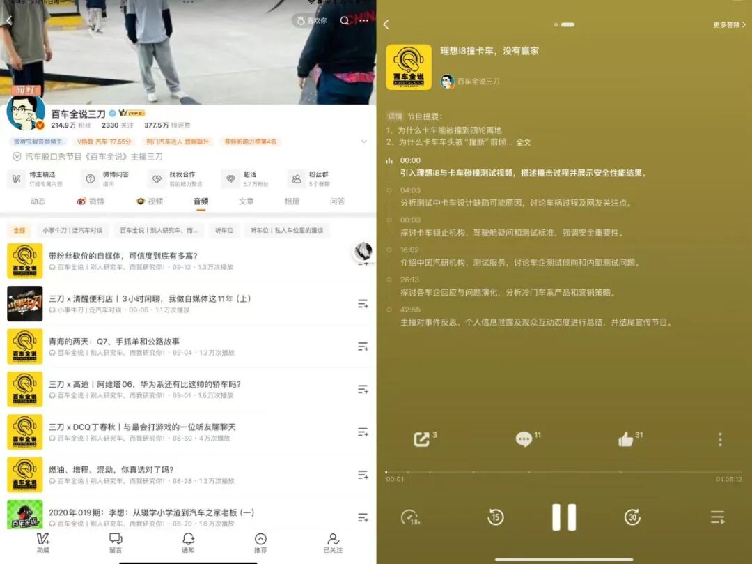 比如“百车全说三刀”的主理人三刀就说,他选择在微博发音频,正是因为“这里做个人IP效率非常高”。