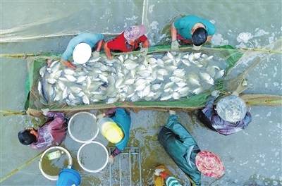 新鲜出塘的黄立鱼在渔网中活蹦乱跳。