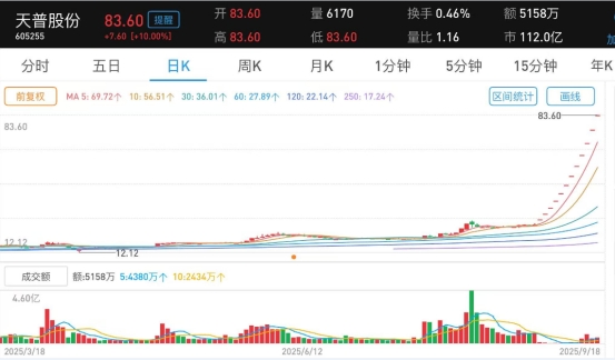 9月18日,天普股份(605255.SH)股票复牌持续“一字”涨停,走出12连板。截至收盘,天普股份报83.6元/股,涨幅10.00%,总市值112亿元。自8月22日以来,公司股价累计涨幅高达213.81%。