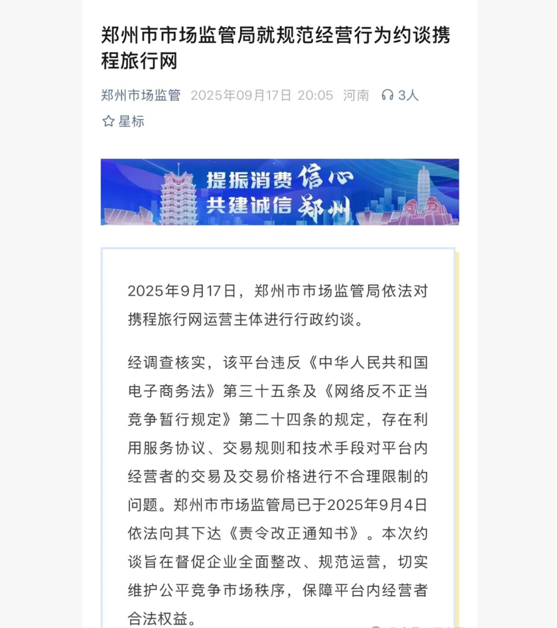 投资快报记者关注到,2025年9月17日,郑州市市场监管局依法对携程旅行网运营主体进行行政约谈。