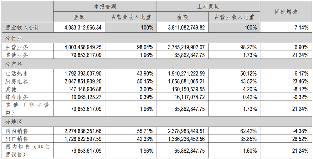 生活热水业务包括燃气热水器、电热水器、即热式电热水器等产品,为高毛利率业务,2023年和2024年,该业务毛利率分别为34.03%和33.94%,高于27.12%的主营业务毛利率。而厨房电器业务包括吸油烟机、燃气灶、集成灶、烹饪中心、净水器等产品,毛利率分别为19.59%和21.37%,远低于主营业务毛利率。