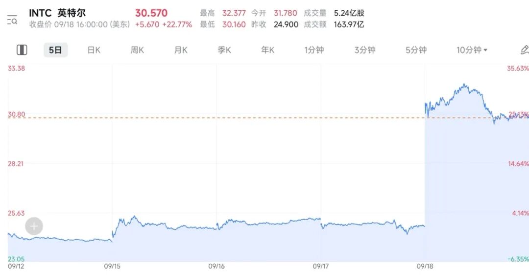 9月18日,英伟达宣布,将向其昔日数十年来的“宿敌”英特尔投资50亿美元。消息一出也直接带飞了英特尔的股价,美股盘前一度最高飙涨超33%,最终收盘报30.57美元,涨幅为24.22%,市值单日增加了230亿美元,最终达1428亿美元。