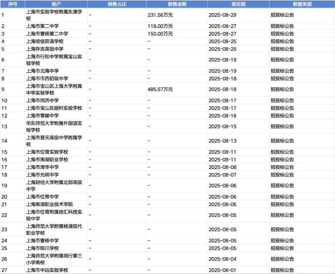 截至9月18日发稿时,天眼查显示,今年8月,绿捷共有27次中标,包括华东师范大学附属外国语实验学校、上海市光明中学、上海市位育中学、上海市清华中学、上海市宝山区行知外国语学校等。