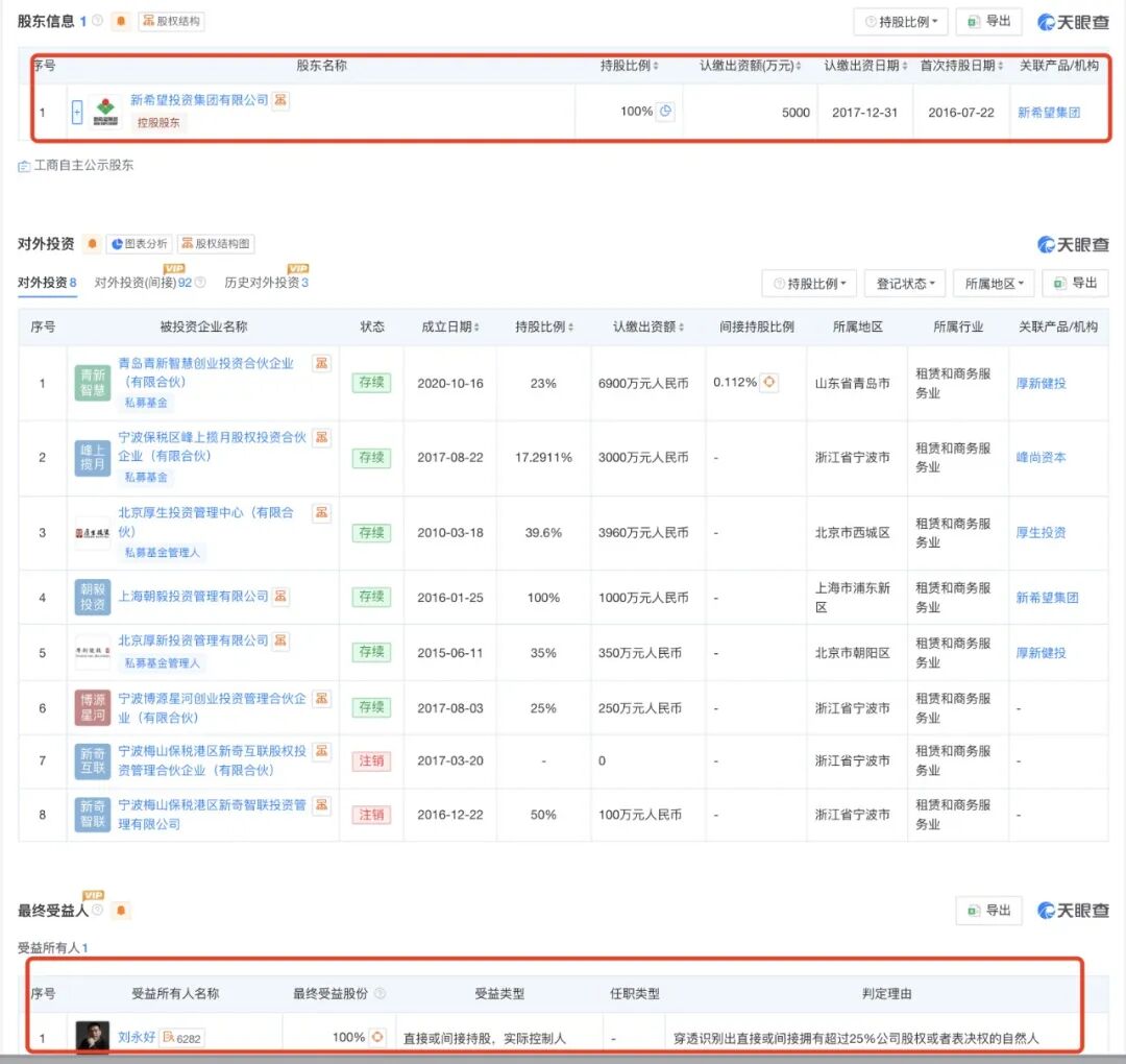 值得注意的是,厚生投资为新希望集团的参投公司。