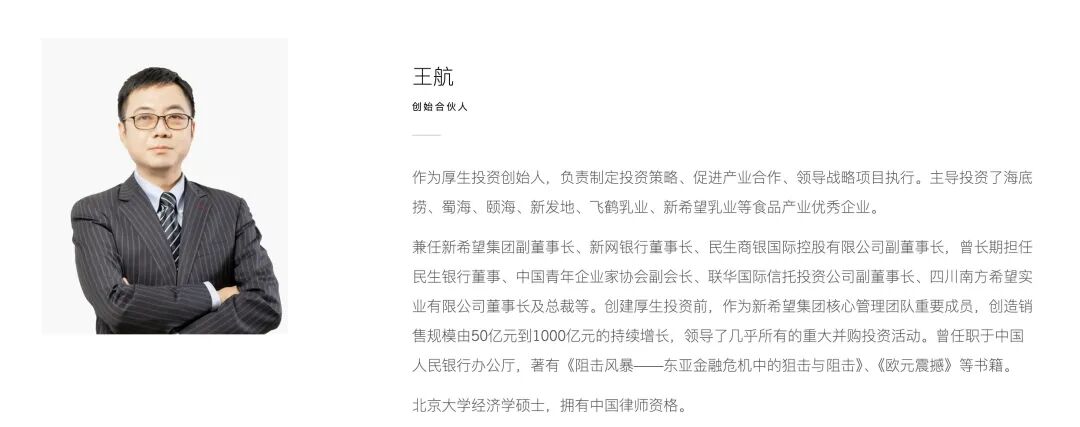 时代周报记者从厚生投资官网获得的信息显示,王航为公司创始合伙人,同时兼任新希望集团副董事长;陈云仪为公司执行董事。而公司的创始合伙人为张天笠,英文名为Alex Zhang。