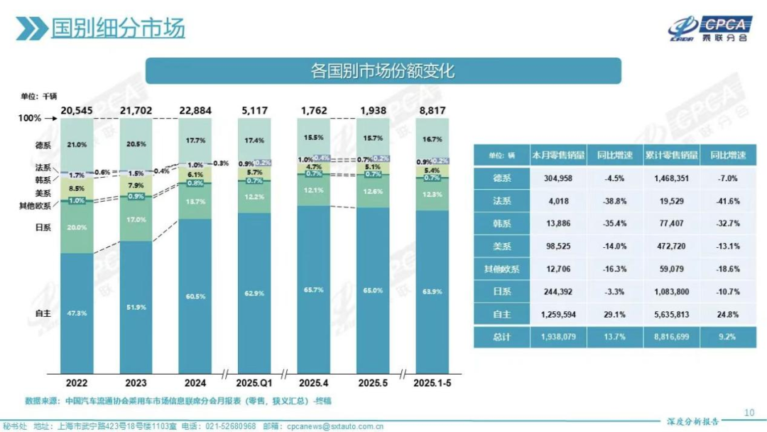 根据乘联会数据,今年1-5月,合资品牌市场份额已被压缩至36%。且自2023年以来,合资品牌的市场份额再没能回到50%以上。