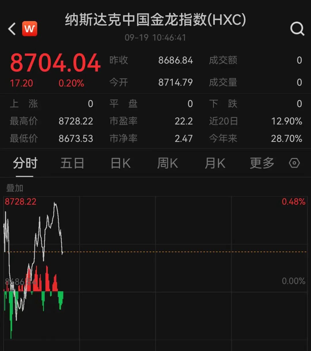 北京时间9月19日晚间,美股三大指数高开,截至22时40分左右,道指涨0.12%,标普500指数涨0.16%,纳指涨0.34%。