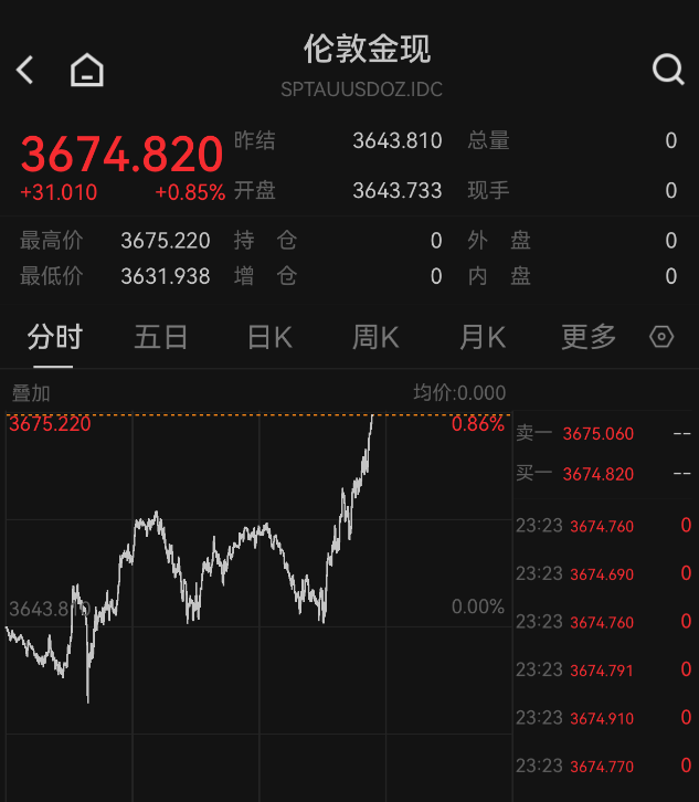 金价走高,现货黄金站上3670美元/盎司,日内涨0.85%。