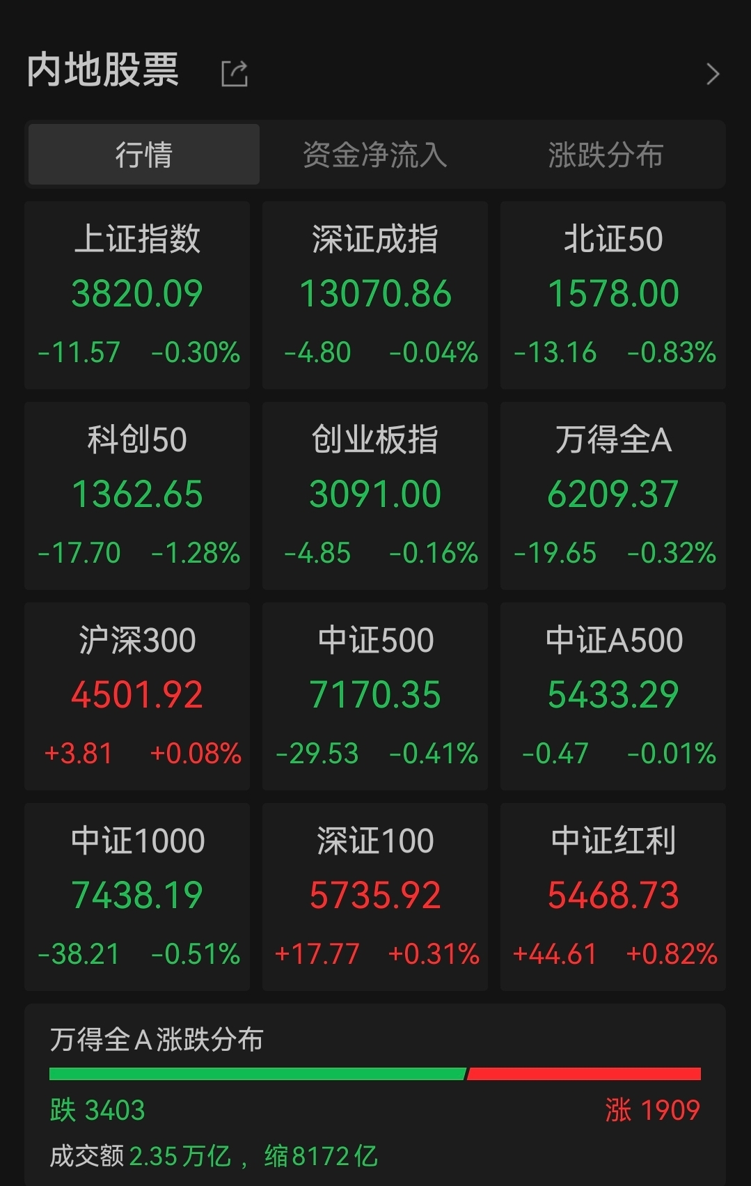 今日A股市场全天震荡走弱,三大指数集体收跌。沪指跌0.30%,深成指跌0.04%,创业板指跌0.16%。量能大幅萎缩,沪深两市成交额2.32万亿,较上一个交易日缩量8113亿。