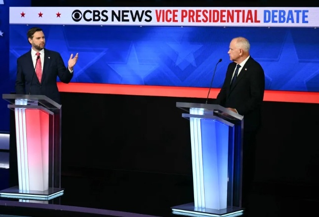 △万斯(左)与蒂姆·沃尔兹(右)参加副总统辩论