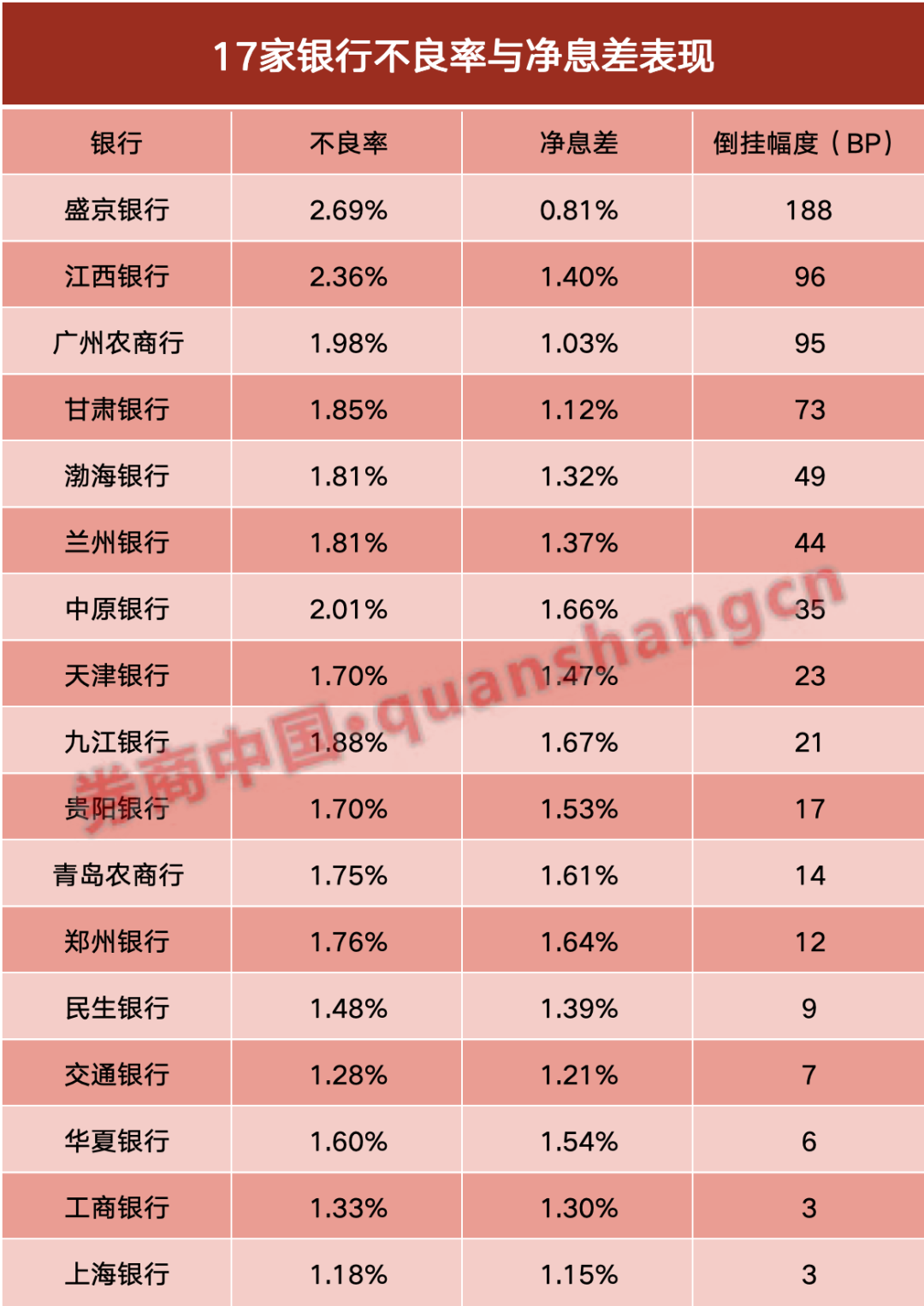 倒挂最严重的前三名(即不良率高于净息差幅度最高),差值多达90BP以上。分别是盛京银行,幅度高达188个BP;其次是江西银行,多达96个BP;再次是广州农商行,为95个BP。盛京银行、江西银行、广州农商行的不良率分别为2.69%、2.36%、1.98%;净息差依次为0.81%、1.4%、1.03%。
