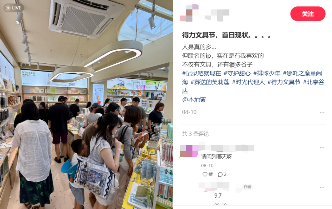 实际上,这份“文具热”从今年8月就开始了。“趣解商业”了解到,得力文具今年夏天带着大量联名IP,在全国各地展开了长达一个多月的“得力超级文具节”;逛展的除了IP粉丝、学生党,也有不少爱做手帐的年轻“打工人”,成了暑期人气“痛展”。