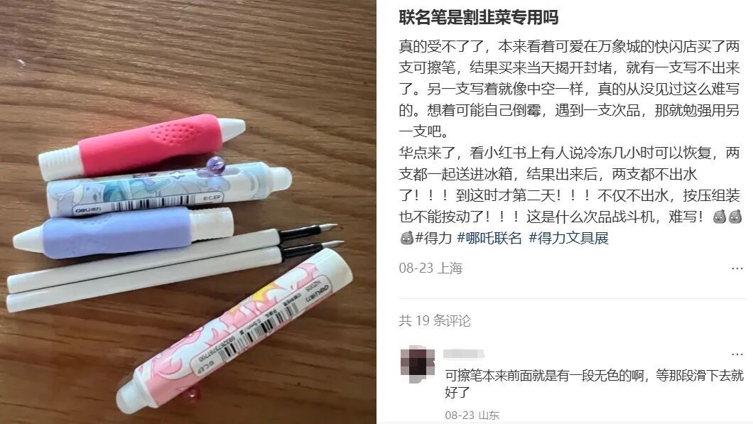 “趣解商业”注意到,得力今年在全国举办的“守护甜心”快闪活动,就曾因为“压货”“排队抢”等被指责是“过度饥饿营销”。还有网友表示,今年得力与《哪吒之魔童闹海》联名的斜挎包、笔袋补货太慢,“催了发货结果订单又被取消了。”
