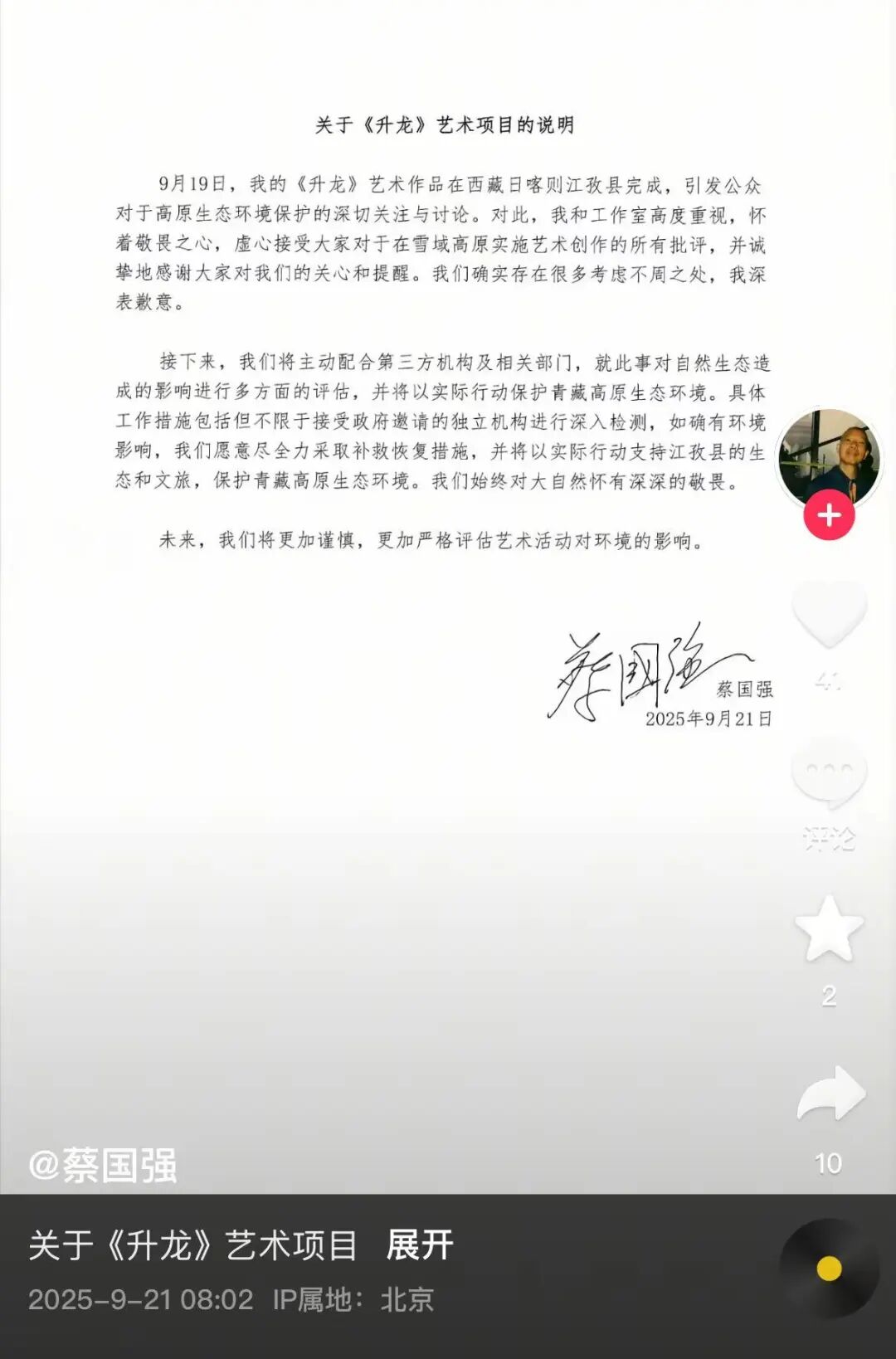 同日,蔡国强在短视频平台发布关于《升龙》艺术项目的说明:“虚心接受大家对于在雪域高原实施艺术创作的所有批评,并诚挚地感谢大家对我们的关心和提醒。我们确实存在很多考虑不周之处,我深表歉意。”