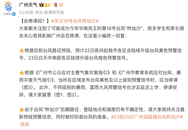 21日14时,台风“桦加沙”中心附近最大风力为17级(60米/秒),预计将以每小时15~20公里的速度向西偏北方向移动。台风“桦加沙”可能成为今年华南风王,很多学生和家长关心受其影响广州会否停课?