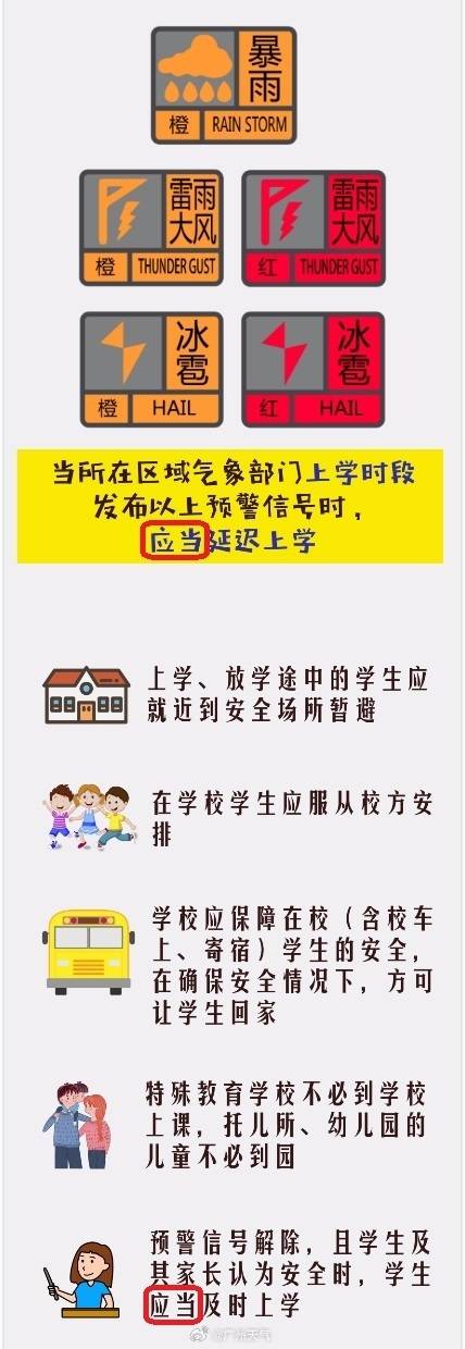 根据《广州市公众应对主要气象灾害指引》和《广州市教育系统应对台风、暴雨灾害天气指引》,当所在区域发布台风黄色及以上级别预警信号时,应当停课。 此外,不同级别的暴雨、雷雨大风预警信号也涉及延迟上学、停课安排,请大家留意。