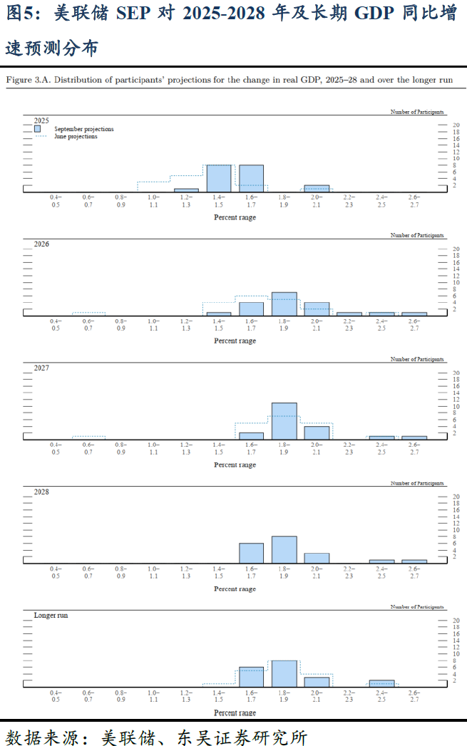 经济预测:预期更多降息将抬升增长与通胀。①产出:将2025Q4至2027Q4的GDP同比增长预测分别上调0.2pct、0.2 pct 、0.1 pct 至1.6%、1.8%、1.9%,新增2028Q4预测为1.8%,即预期未来几年美国经济增长将在1.8%的长期均衡水平附近波动;同时,下调2026、2027年失业率各0.1 pct 至4.4%、4.3%。这一调整显示美联储预期降息将提振经济增长。②通胀:相比6月,仅对明年通胀预测有所调整,将2026Q4 PCE和核心PCE预测值由2.4%上调至2.6%。③风险:对预测不确定性和风险的评估显示,美联储认为未来GDP的下行风险边际缓释,但失业率的下行风险边际强化;通胀上行风险较此前边际缓释。