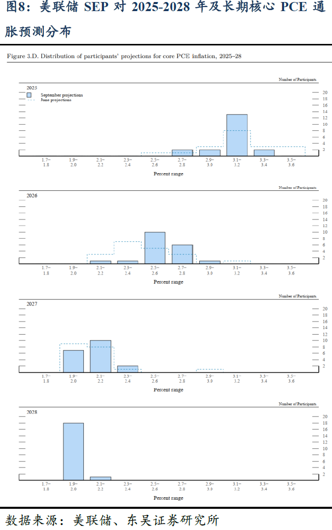 发布会:增量鸽派信息不多,对利率前景表态偏鹰,给市场预期泼冷水。①增长前景方面,强调就业的下行风险,增量信息不多。Powell在发布会上表示,就业需求明显放缓;劳务市场供需双弱,而不仅仅是移民因素造成;就业的下行风险已经上升,由于招聘率降低,如果裁员率上升,则会迅速推高失业率,这是政策目标转变的原因之一;就业的盈亏平衡增长率正在下降。同时,Powell表示,家庭部门状况仍然良好,消费稳健,因此经济活动的整体状况维持平稳。②通胀前景方面,再次表示关税的影响是一次性的。Powell认为现在通胀的上行压力小于4月份;关税对核心商品通胀产生影响,但是一次性的,爆发持续性通胀的概率不大;预计对核心PCE通胀的影响在0.3-0.4个百分点。总体来看,Powell对于增长和通胀的看法与8月Jackson Hole会议上的观点保持一致,没有太多鸽派的增量信息。③货币政策方面,Powell的表态相较于市场预期更为鹰派,表示不认为会快速降息(don\'t feel need to move quickly on rates);不认可市场对于未来利率路径的预期,或暗示当前市场对于2026年政策利率降至2.9%的预期过于乐观;同时,Powell表示此次降息可视为“风险管理”降息;本次会议没有广泛地讨论降息50bps。