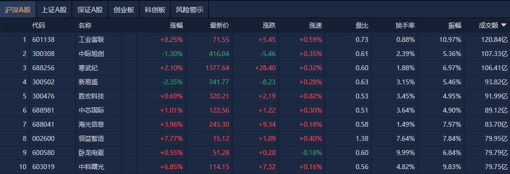 个股方面,工业富联成交额超120亿元居首,中际旭创、寒武纪、新易盛成交额靠前。
