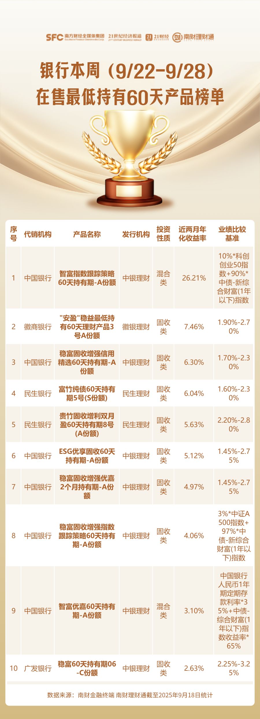 编者按:当前银行理财货架产品琳琅满目,诸如“增强”“稳健”“均衡”等名称相近、特征模糊的产品层出不穷,投资者应如何甄别与选择?为降低投资者的选择成本,南财理财通课题组从代销机构角度入手,每周一聚焦各渠道当周在售的理财产品,搜罗其中业绩表现优异者,并发布代销产品业绩榜单。