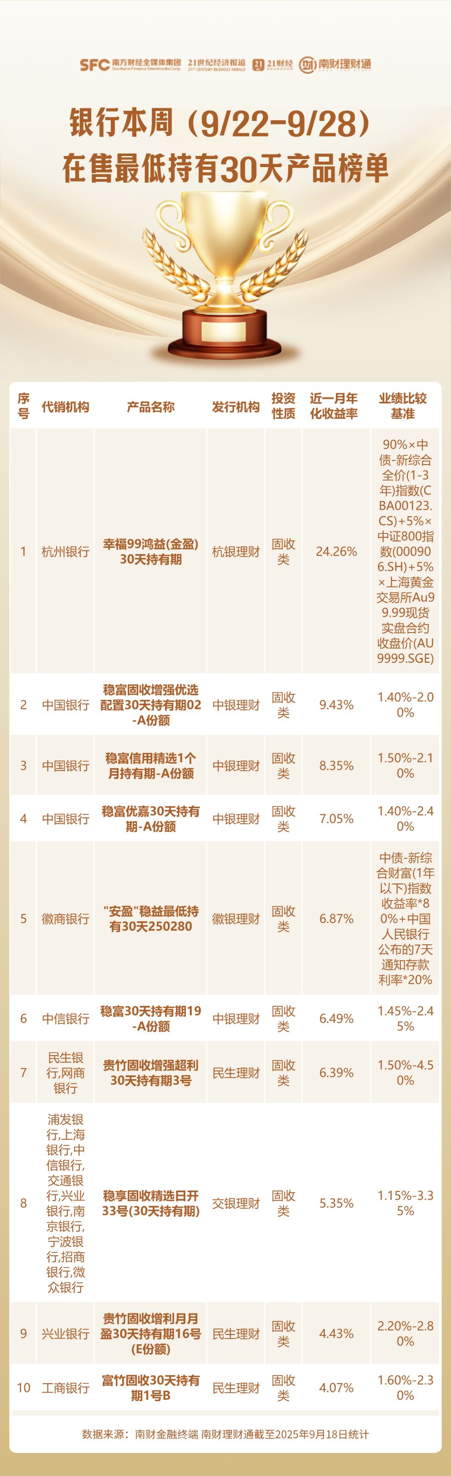 需要特别提醒的是: 本榜单对理财产品“在售”状态的判断基于其投资周期推算。但实际情况中,部分产品可能因额度售罄,或银行针对不同客户展示的产品清单存在差异而无法购买。因此,建议投资者以代销银行APP的实际展示为准。