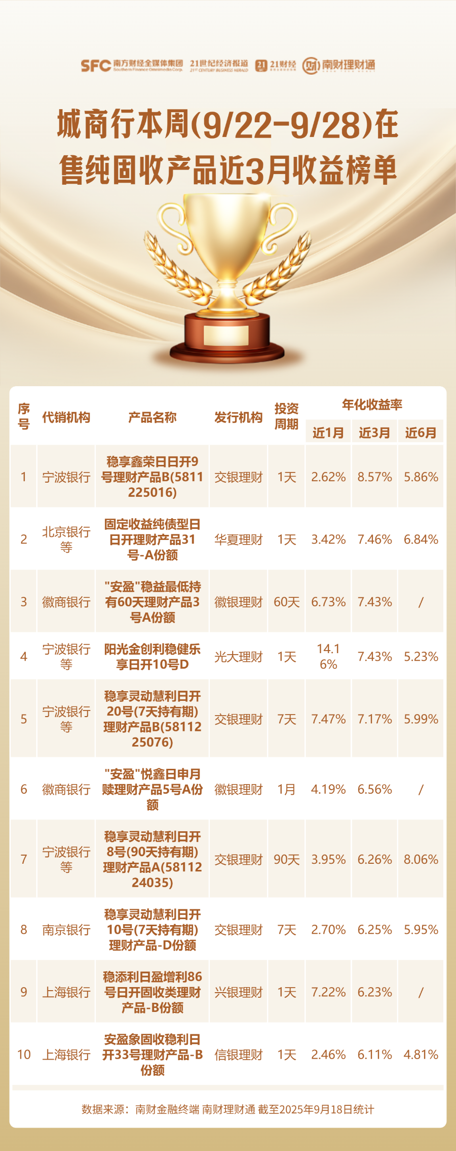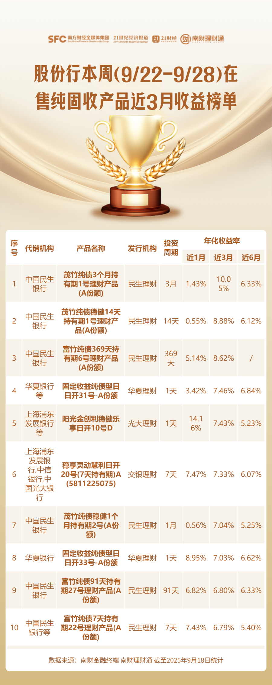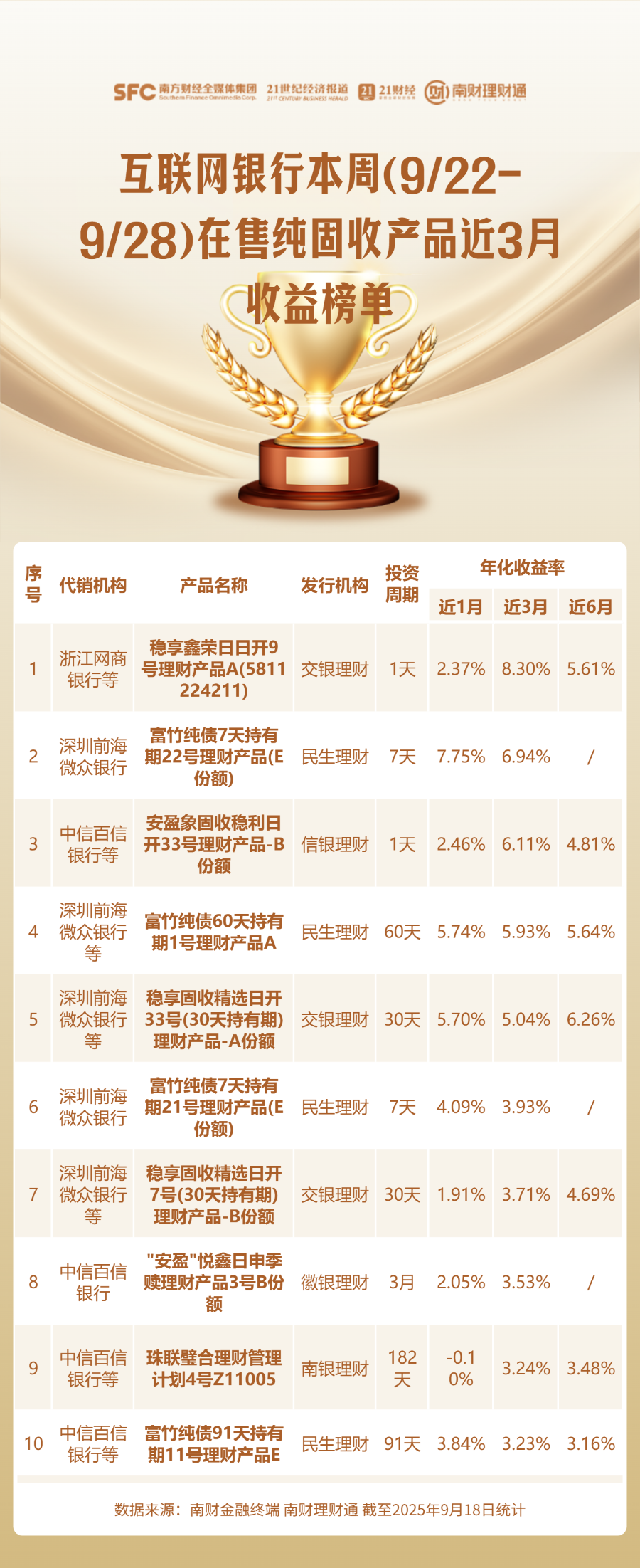 编者按:当前银行理财货架产品琳琅满目,诸如“增强”“稳健”“均衡”等名称相近、特征模糊的产品层出不穷,投资者应如何甄别与选择?为降低投资者的选择成本,南财理财通课题组从代销机构角度入手,每周聚焦各渠道当周在售的理财产品,搜罗其中业绩表现优异者,并发布代销产品业绩榜单。