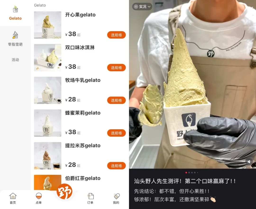 野人先生小程序显示,冰淇淋售价为28-38元。其中,爆款产品开心果冰淇淋卖38元/130g、双口味冰淇淋卖38元/155g。