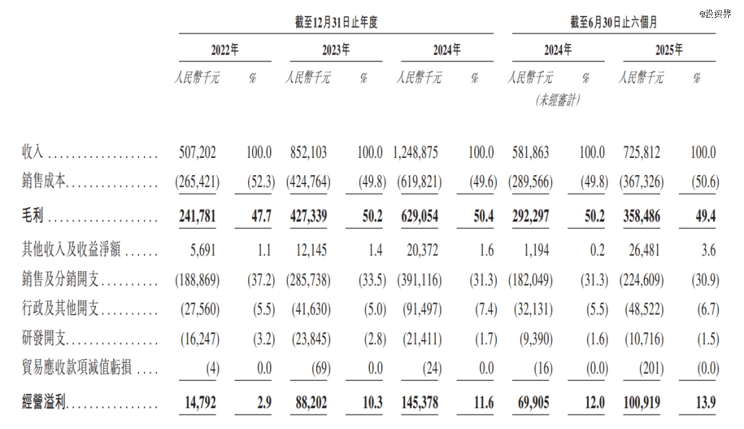 招股书显示,2022年-2024年前9个月,BeBeBus实现收入5.07亿元、8.52亿元及8.84亿元,其经调整净利润由997.4万元增长至7357.2万元,增长超6倍;毛利率则分别为47.7%、50.2%及49.5%,而公司旗下四大场景的产品,绝大多数毛利率都介于40-60%之间。