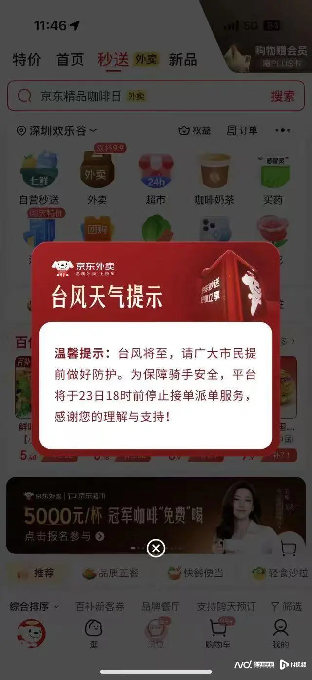 京东外卖则表示,会密切关注超强台风“桦加沙”,并迅速启动恶劣天气应急预案,在保障骑手配送安全的前提下,尽力满足市民生活的物资需求,同时将根据台风预警的变化,及时调整配送运力安排。他们强调,会以安全为第一标准,调整全职骑手的出勤安排。南都记者注意到,京东外卖在深圳地区弹窗提醒用户将于23日18时停止接单派单服务。