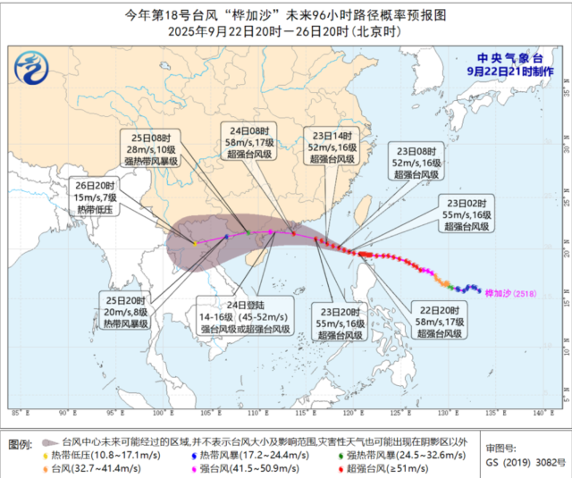 截至22日21时,台风“桦加沙”位于距离阳江市东偏南方向约900公里的海上,强度维持超强台风级(17级),最大风力已减弱至58米/秒。