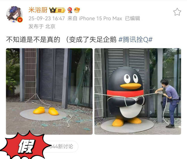 比如腾讯公司门口的企鹅雕塑,公司为了防御台风,将企鹅用绳拴了起来。而有网民传播的图片显示企鹅只剩双脚,上身被风吹走。腾讯QQ回应:“鹅拴着呢,稳稳的。”