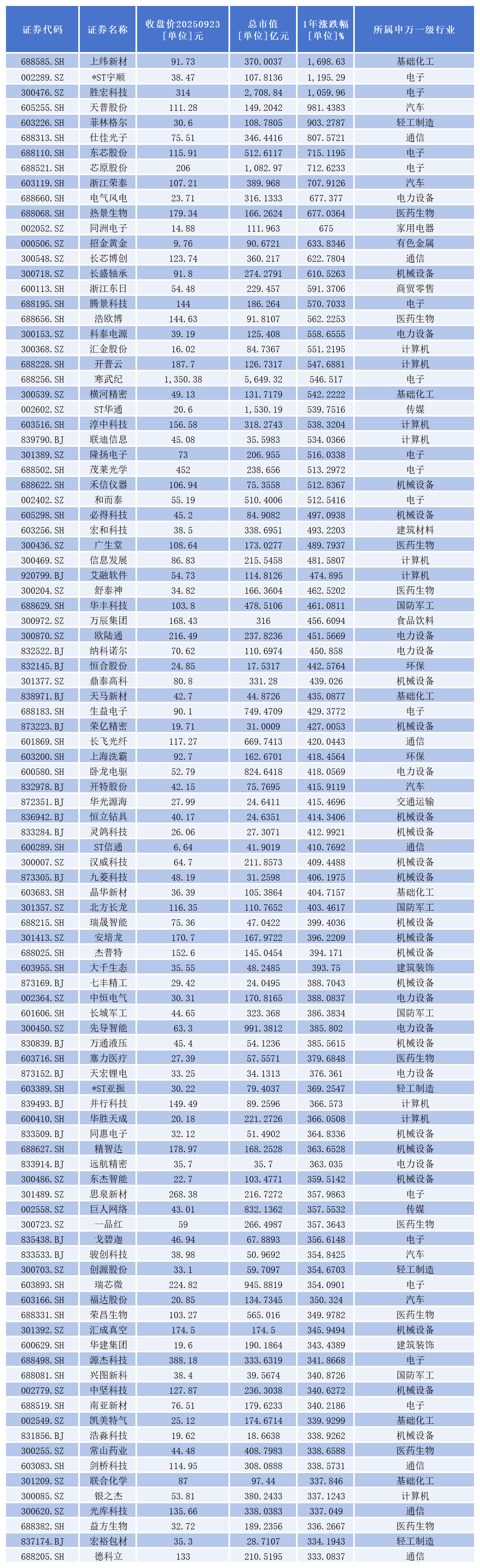 其中,1333家股价成功实现翻倍;30家股价涨幅超过500%,具体包括:
