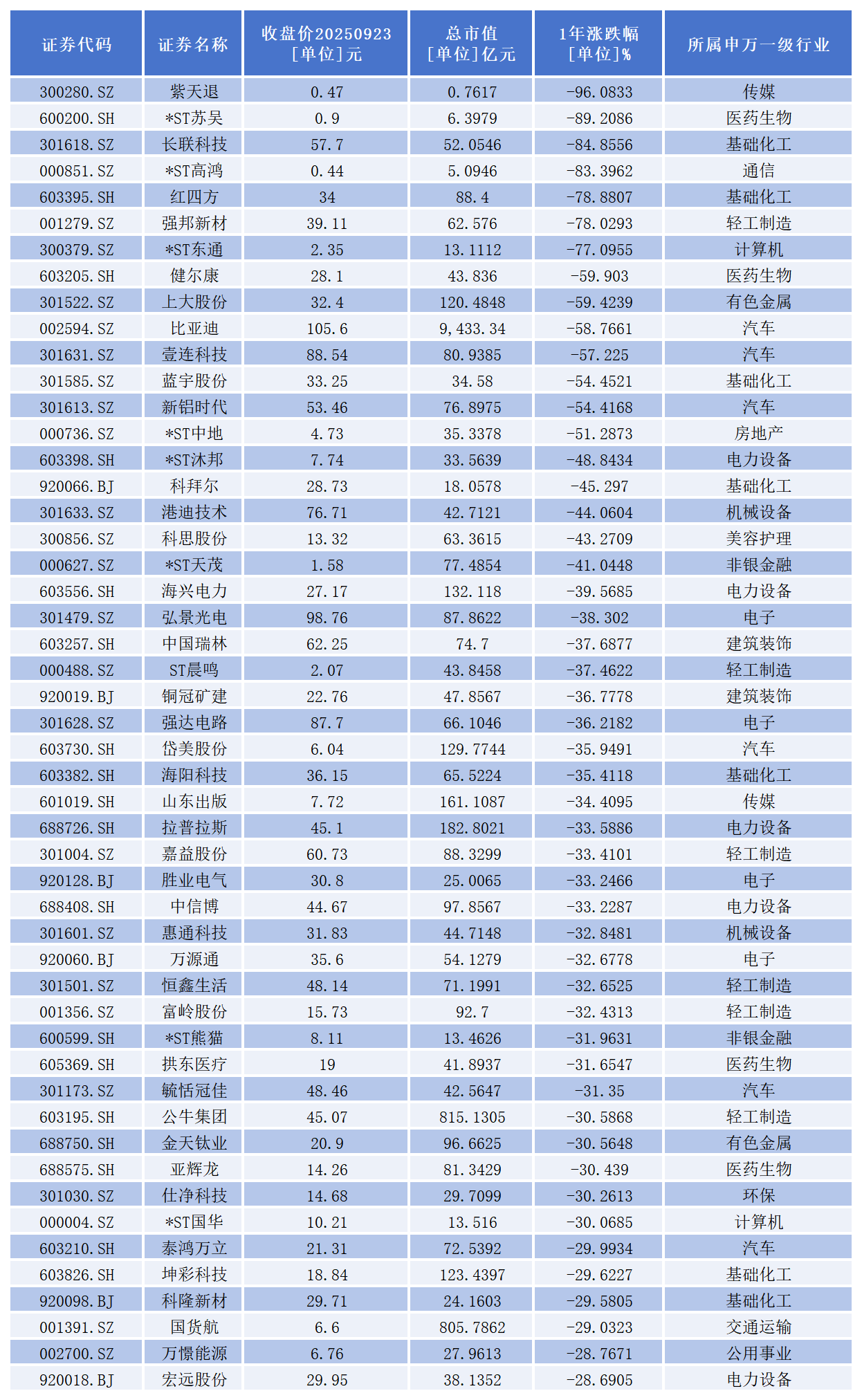 “924行情”跌幅前50榜单