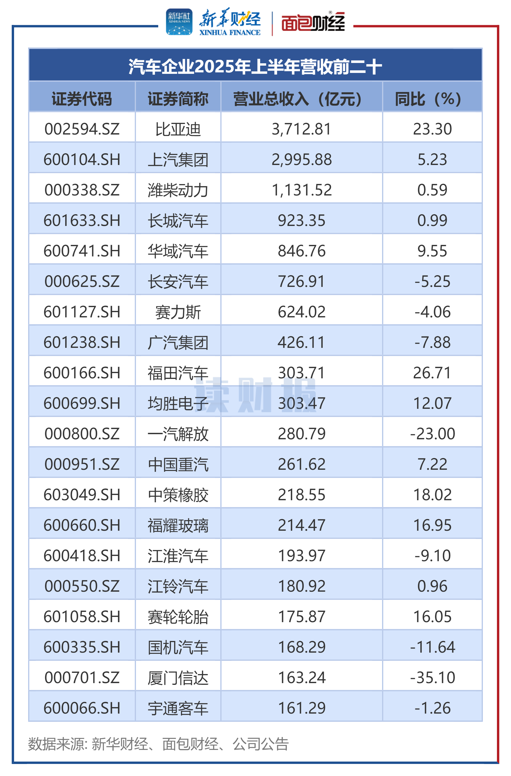 比亚迪、上汽集团、潍柴动力的营收规模居前,2025年上半年分别实现收入3712.81亿元、2995.88亿元、1131.52亿元。增速方面,北汽蓝谷、富特科技、威帝股份增速超过100%,上海物贸、金鸿顺等4家公司收入降幅超过30%。
