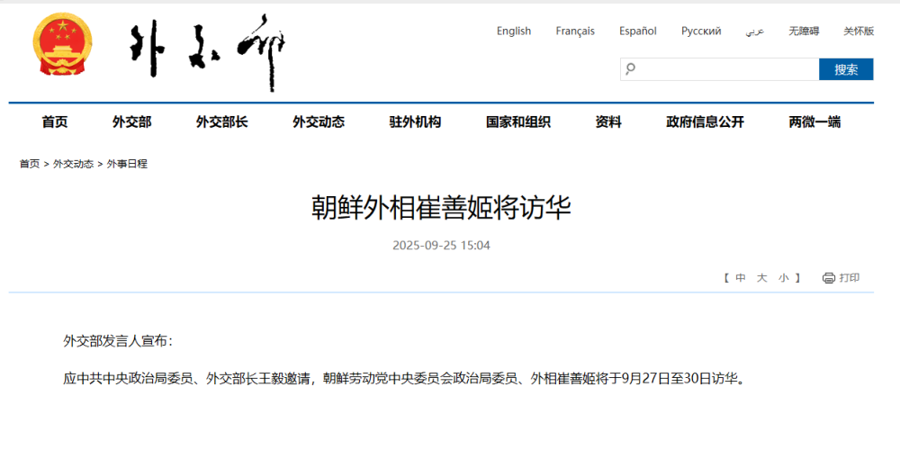 应中共中央政治局委员、外交部长王毅邀请,朝鲜劳动党中央委员会政治局委员、外相崔善姬将于9月27日至30日访华。