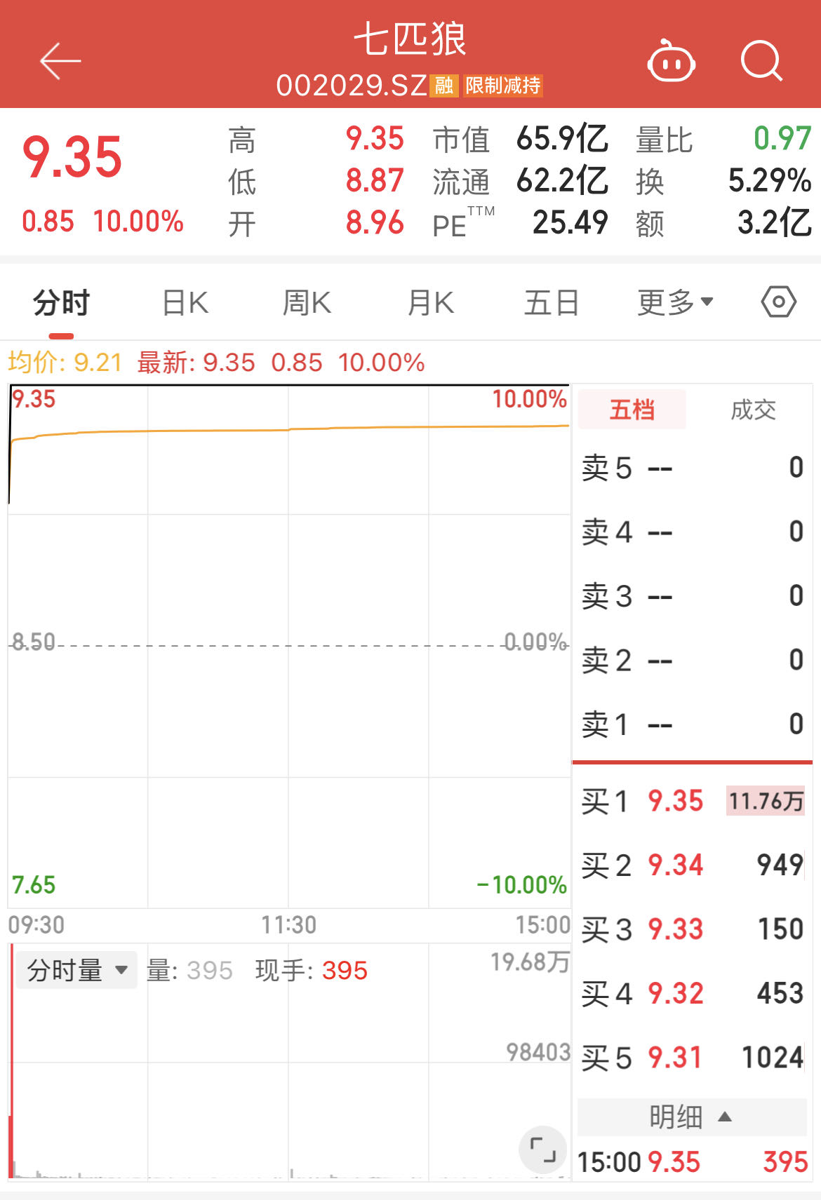 9月25日,七匹狼开盘不久即涨停,报9.35元/股,总市值达65.9亿元,收获两连板。这已是该股连续第二个交易日涨停。截至收盘,封板资金达1.1亿元。