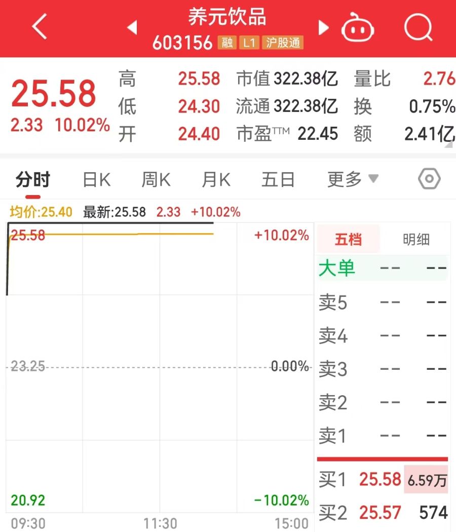 9月25日,养元饮品(603156.SH)盘中快速上涨,9点32分触及涨停板,截至收盘,报25.58元。这是公司近两日收获的第二个涨停。